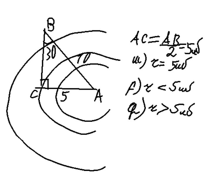 2)ABC եռանկյան մեջ AB=10 սմ, <C = 90o, <B = 30o :Տարե՛ք A կենտրոնով շրջանագիծ։ Ինչպիսի՞ն պետք է լինի այդ շրջանագծի շառավիղը, որպեսզի BC ուղիղը՝