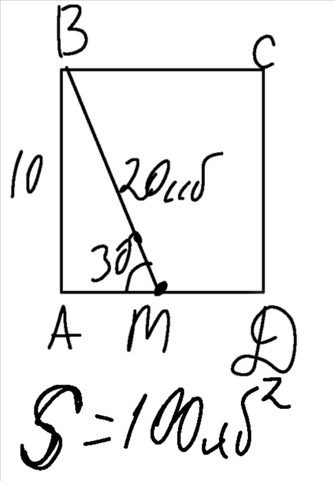 2)Տրված է ABCD քառակուսին։ AD ճառագայթի վրա վերցված է M կետն այնպես, որ <AMB=30o, և BM=20 սմ։ Գտեք այդ քառակուսու մակերեսը։