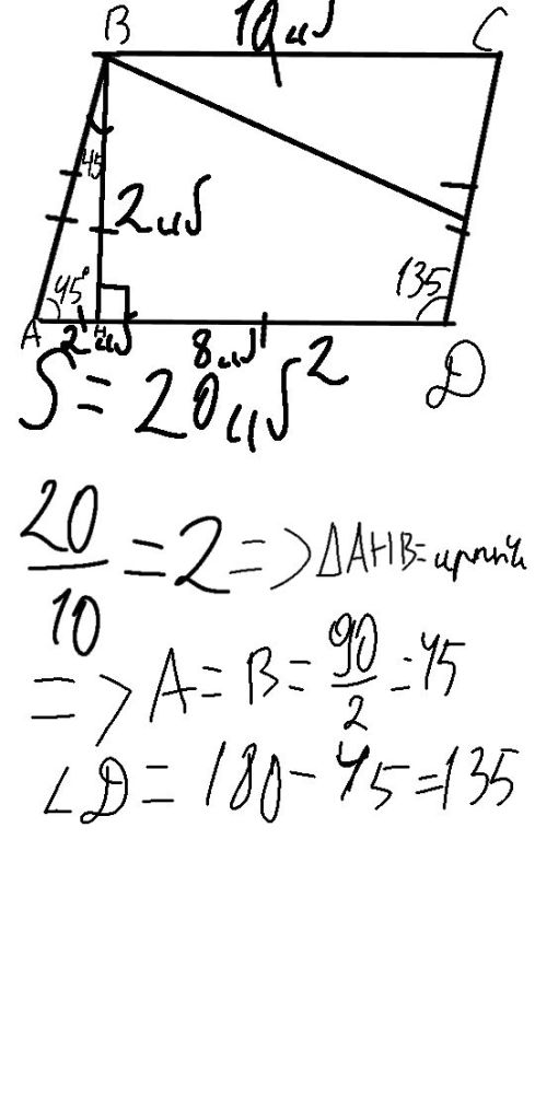 4)Գտեք զուգահեռագծի անկյունները, եթե նրա մակերեսը 20 սմ2 է, իսկ բութ անկյան գագաթից կողմերից մեկին տարված բարձրությունը այդ կողմը տրոհում է 2 սմ և 8 սմ երկարությամբ հատվածների՝ սկսած սուր անկյան գագաթից։