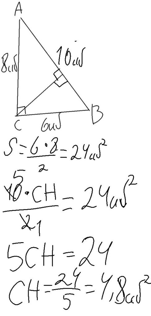 8)Ուղղանկյուն եռանկյան էջերը 6 սմ և 8 սմ են, իսկ ներքնաձիգը՝ 10 սմ: Գտեք ներքնաձիգին տարված բարձրությունը: