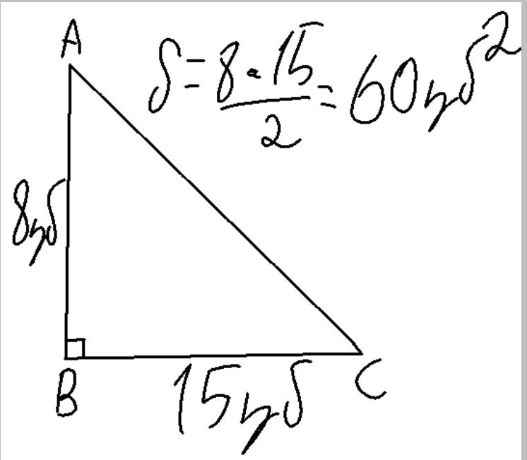 4)ABC եռանկյունում <B = 90օ , AB = 8 դմ, BC = 15 դմ: Գտեք եռանկյան մակերեսը: