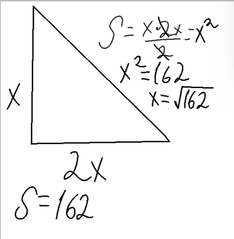5)Ուղղանկյուն եռանկյան էջերից մեկը երկու անգամ մեծ է մյուսից, մակերեսը 162 սմ է: Գտե՛ք այդ եռանկյան էջերը: