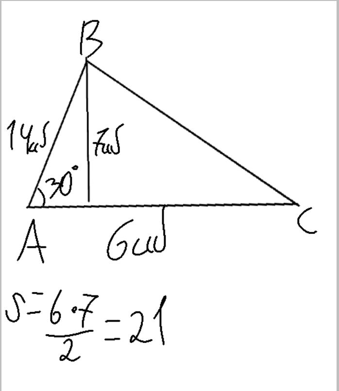 7)ABC եռանկյան մեջ <A = 30օ , AB = 14սմ , AC = 6 սմ: Գտեք եռանկյան մակերեսը: