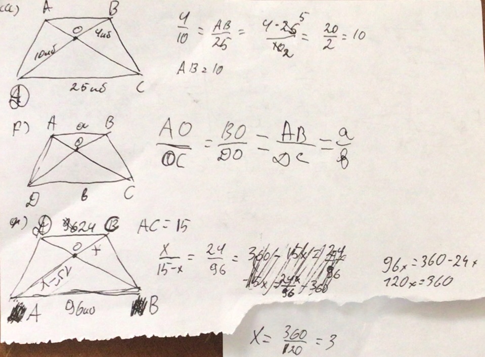 3)AB և CD հիմքերով ABCD սեղանի անկյունագծերը հատվում են O կետում։ Գտեք`